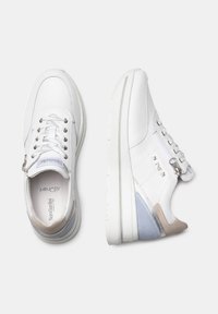 Zapatillas blancas con detalles en azul claro y beige, materiales de cuero y textil, punta redondeada, diseño con cordones y suela gruesa blanca.