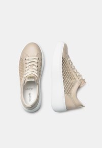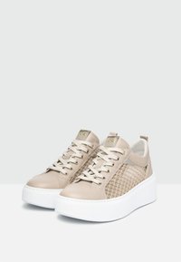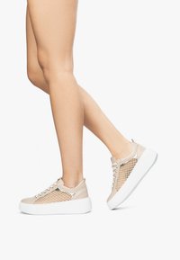 Zapatillas beige con paneles laterales de malla, punta redondeada y suela plataforma blanca. Presentan cierre con cordones y detalles metálicos en la parte superior.
