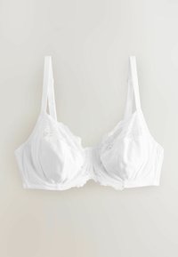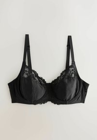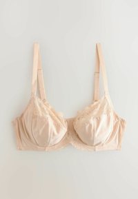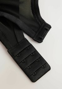 Tres sujetadores con encaje en beige, blanco y negro, dispuestos verticalmente con tirantes ajustables sobre un fondo blanco.