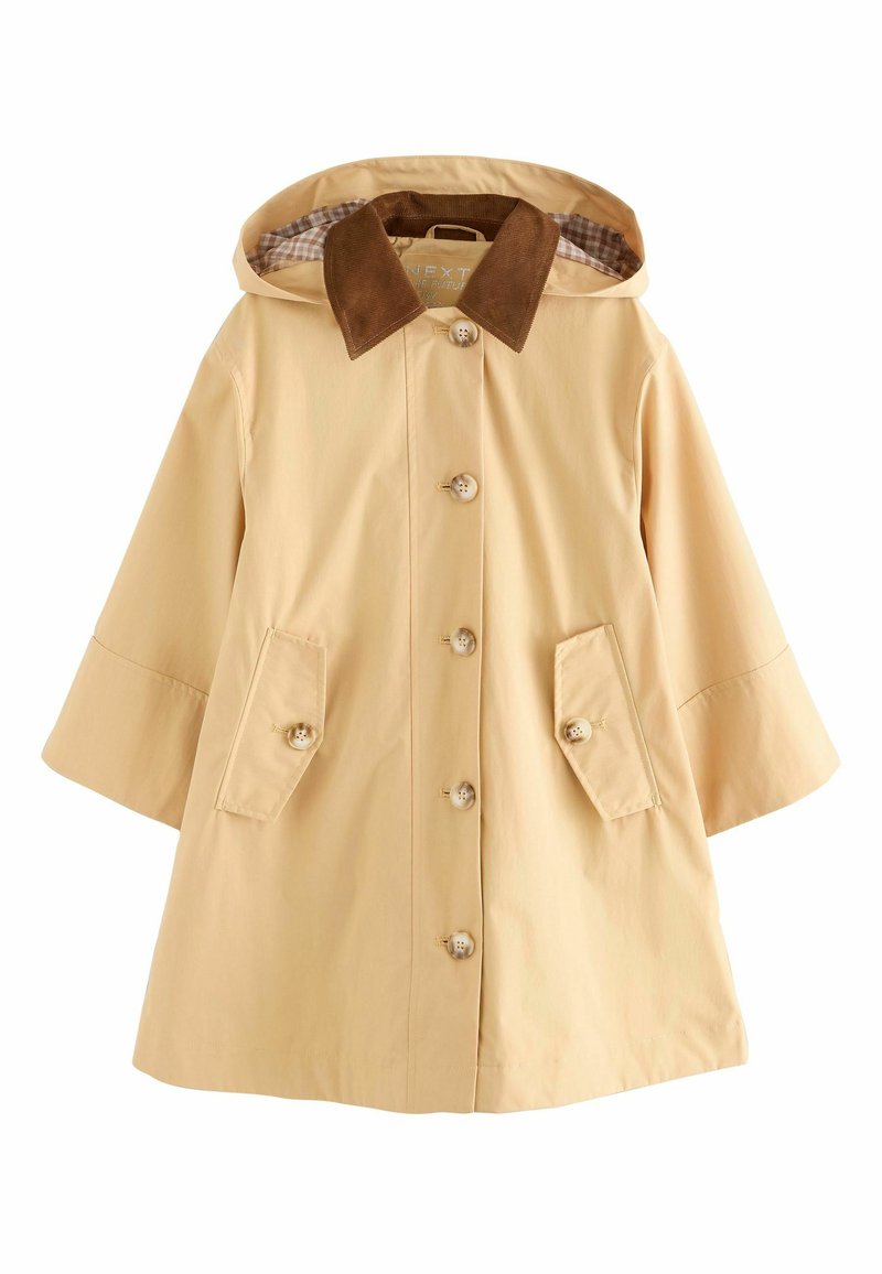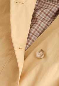 Impermeable amarillo claro con cuello de pana marrón, grandes botones y dos bolsillos delanteros; cuenta con un forro a cuadros y mangas cortas.