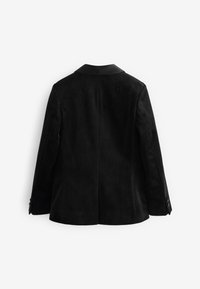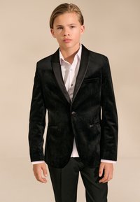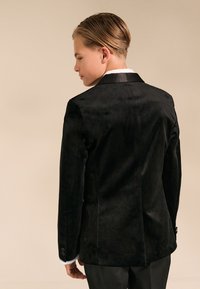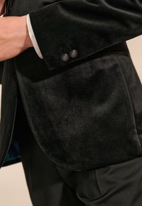 Primer plano de una persona que lleva una chaqueta de traje de terciopelo negro con dos botones cubiertos de tela en la manga y puño de camisa blanco visible.