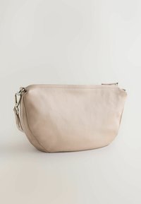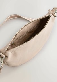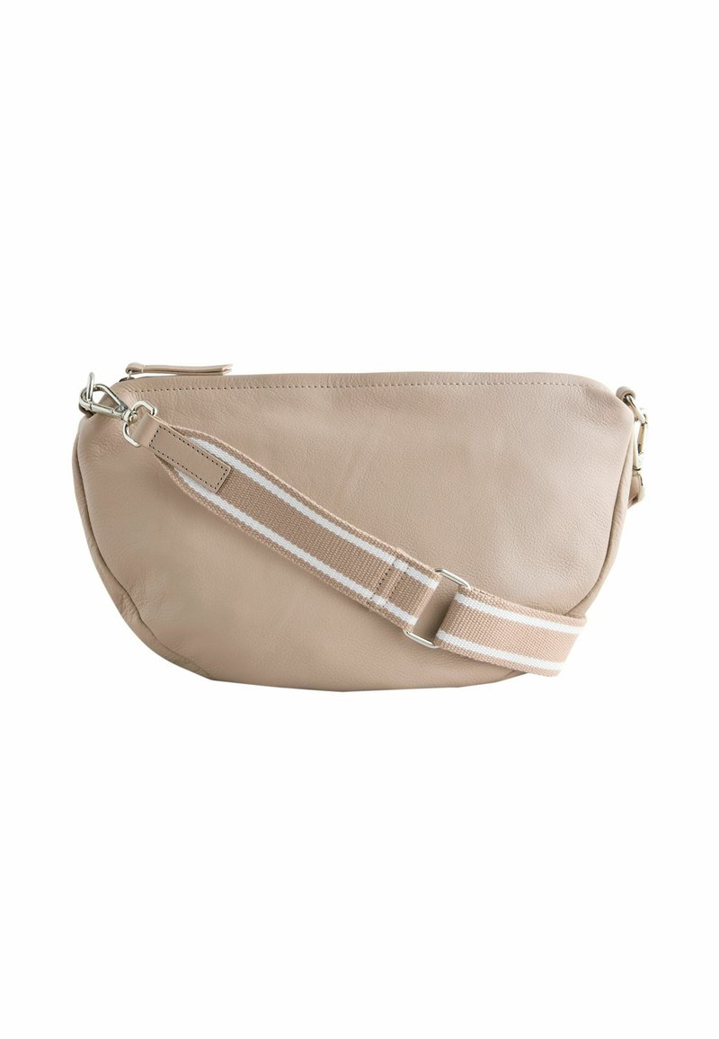 Bolso de hombro de cuero beige con una correa ancha beige que presenta dos rayas blancas y cierres de metal plateado y hebilla.