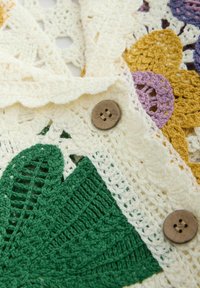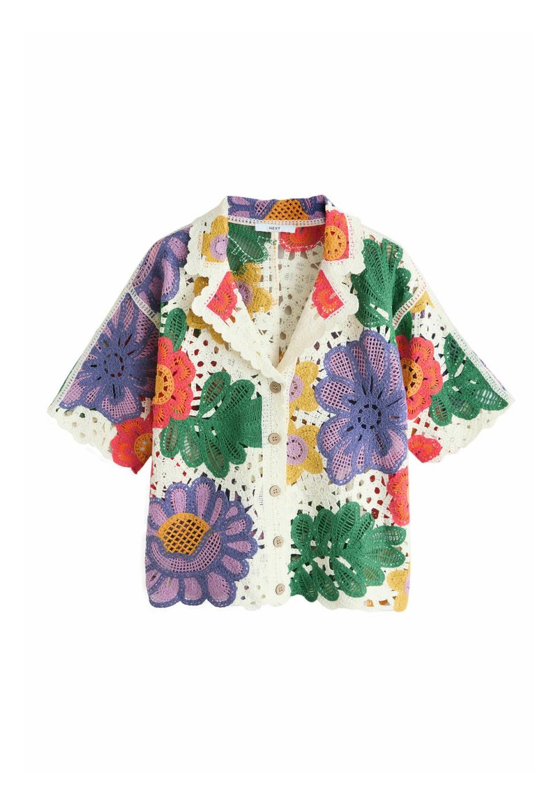 Camisa de manga corta con botones de crochet con patrones florales multicolores en tonos morado, verde, rojo, amarillo y bordes ondulados blancos.