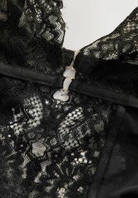 Body de encaje negro con tirantes ajustables, escote corazón y detalle de botones en la parte delantera. Encaje transparente con bordes en forma de ondas.