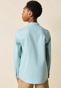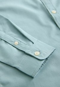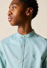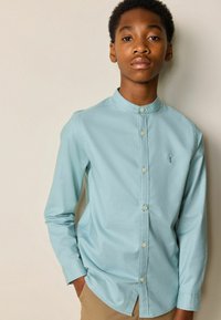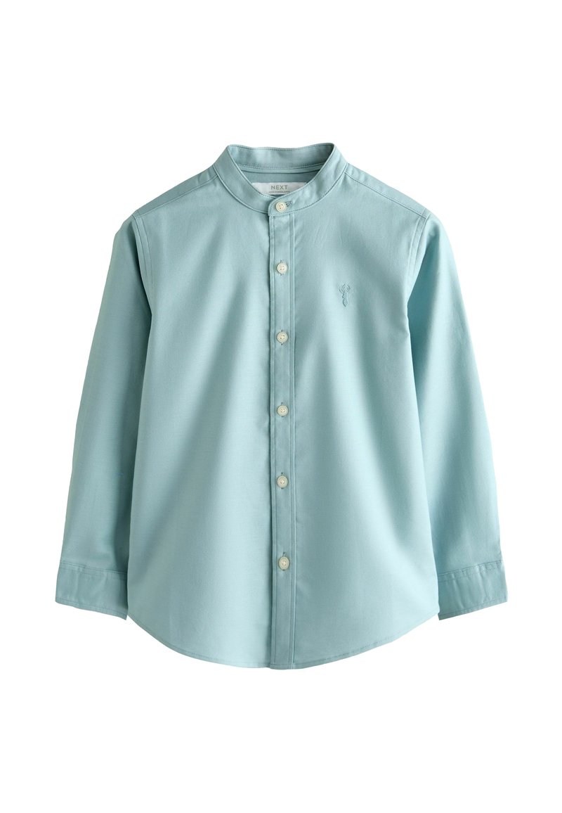 Camisa azul claro con botones y cuello mandarín, mangas largas y un pequeño logotipo bordado en el pecho izquierdo. Textura de tela suave.