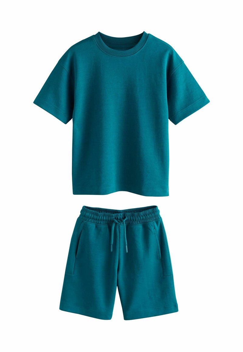 Conjunto de ropa deportiva de algodón en color azul verdoso que incluye una camiseta de cuello redondo con mangas cortas y pantalones cortos con cordón y bolsillos laterales.