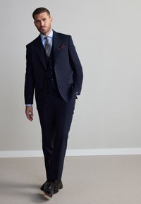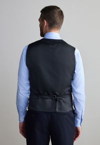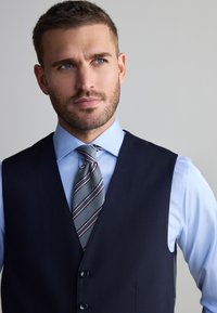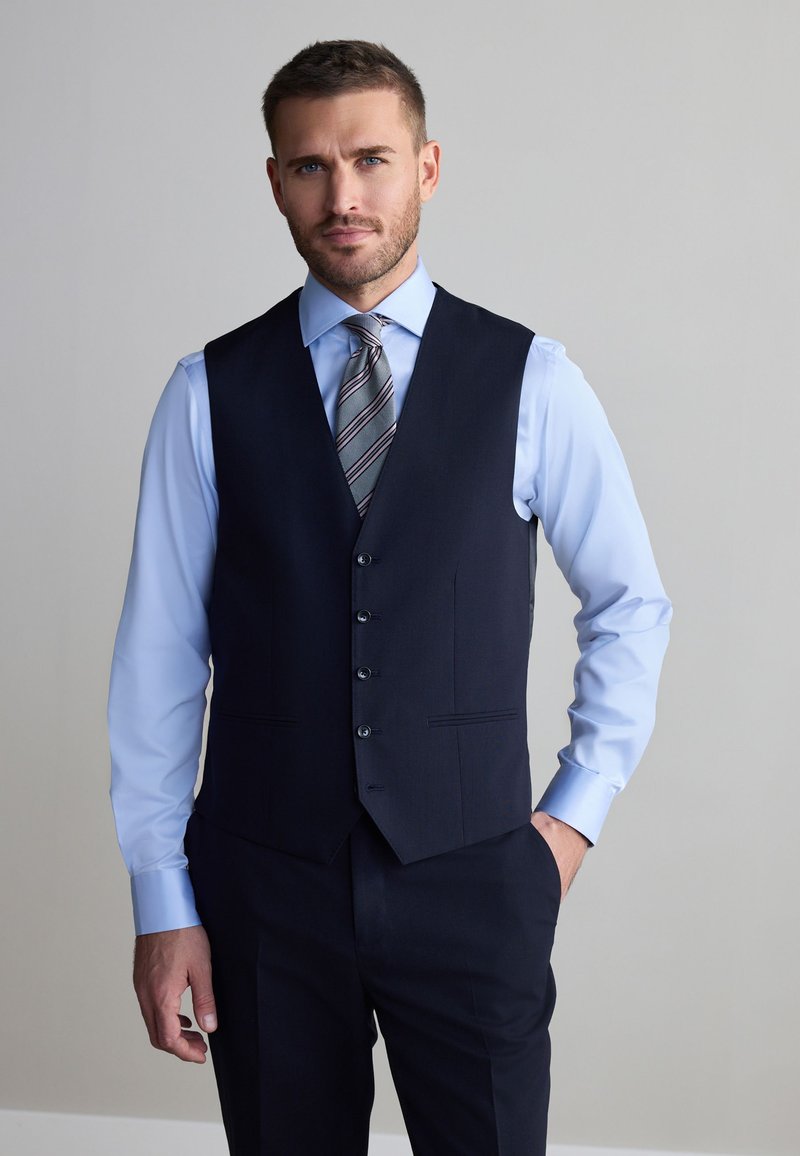 Hombre con cabello corto y barba que lleva camisa azul de vestir, corbata a rayas y chaleco oscuro abotonado, de pie con una mano en el bolsillo contra un fondo liso.