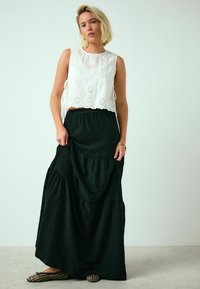 Mujer con una falda larga negra de volantes, con tejido texturizado, y una blusa blanca sin mangas de encaje, de pie sobre un suelo claro.