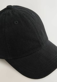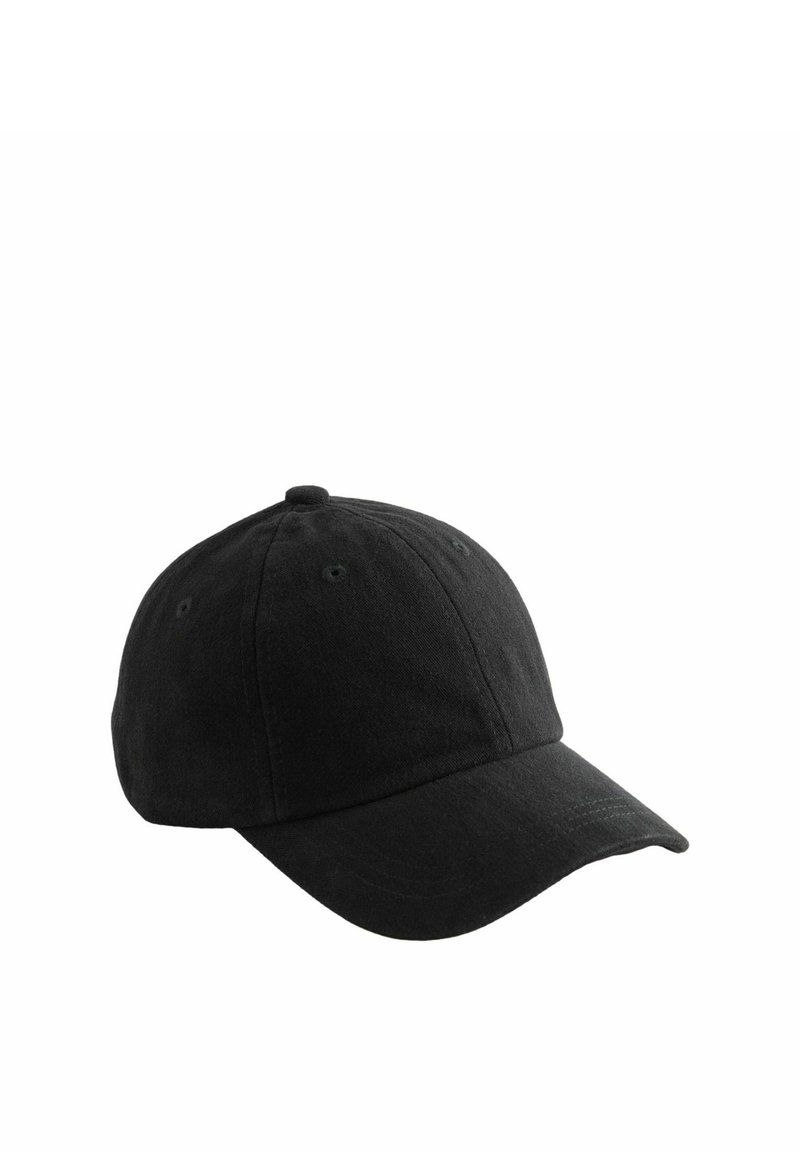 Gorra de béisbol de algodón negra con visera curva, diseño de seis paneles y orificios de ventilación. Costuras resistentes y superficie de tela texturizada.
