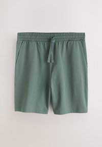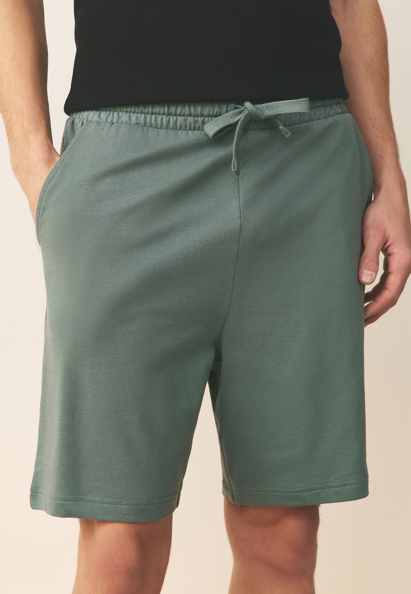 Hombre con pantalones cortos verdes de cintura elástica con cordón y bolsillos delanteros, de pie frente a un fondo neutro.