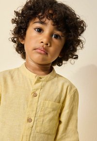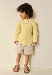 Niño pequeño con cabello rizado que lleva una camisa amarilla abotonada, pantalones cortos beige y sandalias color canela, de pie contra una pared color crema mirando hacia la izquierda.