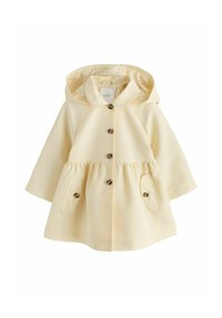 Abrigo ligero amarillo con capucha, cuello redondeado, cierre frontal con botones, dos bolsillos delanteros y detalle de cintura fruncida. Textura suave.