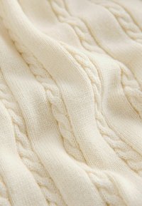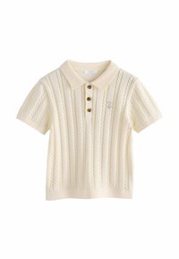 Polo de manga corta color crema con un patrón de punto tipo cable texturizado, tres botones marrones y un pequeño logo bordado en el pecho.