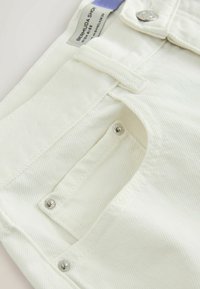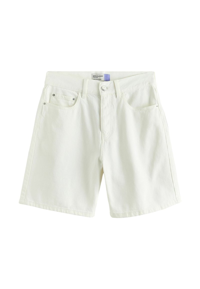 Pantalones cortos bermuda de denim blanco con bolsillos delanteros, trabillas para cinturón y cierre con botón en la cintura.