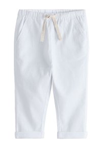 Pantalones de tela suave en azul oscuro con cintura elástica y cordón crema. Incluyen bolsillos laterales y puños enrollados en los tobillos.