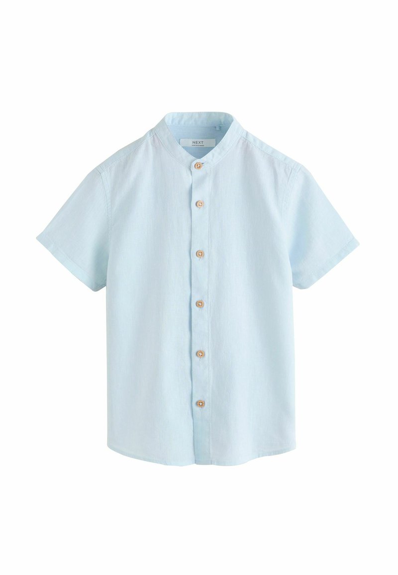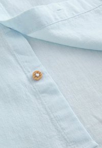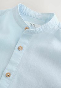Camisa azul claro de manga corta con cuello mao y seis botones marrones en la parte delantera.