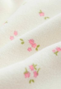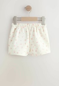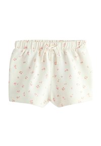 Pantalones cortos blancos con una textura suave, que presentan un estampado floral de pequeñas flores rosas, cinturilla elástica y detalle de cordón.