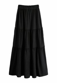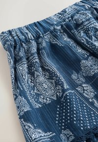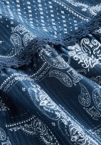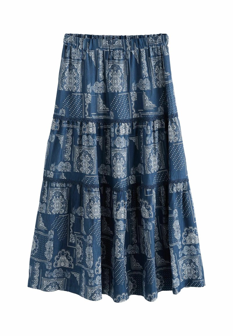 Falda de volantes azul con patrones intrincados en blanco de cachemira y patchwork geométrico, con cintura elástica.