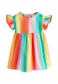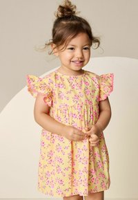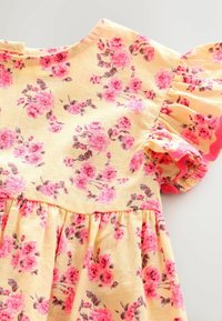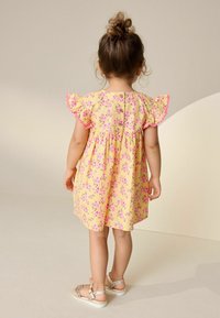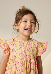 Vestido amarillo con flores y detalles en rosa, mangas cortas con vuelo, cintura fruncida y bolsillos laterales, con pequeñas flores rosas y moradas.