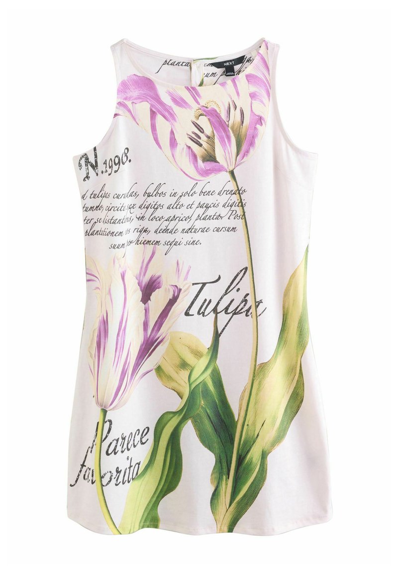 Camiseta sin mangas floral con grandes tulipanes morados sobre un fondo claro, con acentos de texto impresos. Hecha de una mezcla de algodón suave.
