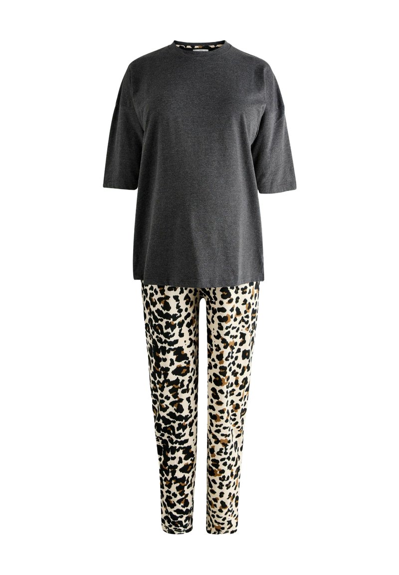 Top suelto de manga corta de color gris oscuro combinado con pantalones ajustados de estampado de leopardo en beige, negro y marrón sobre fondo blanco.