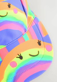 Gorra colorida con ala ancha, con un patrón de arcoíris y caras sonrientes en un tejido brillante e impermeable. Diseñada para la protección solar.