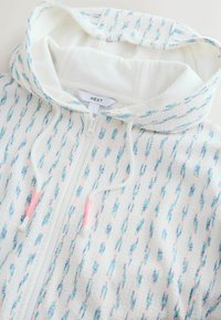 Sudadera blanca con cremallera, capucha y mangas largas, con patrones verticales de rayas azules y rosas, y bolsillos delanteros.
