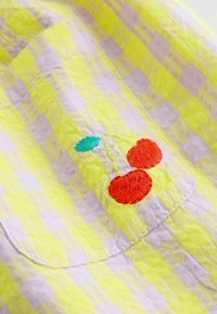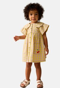 Vestido a cuadros amarillo y lavanda con mangas cortas, cuello con bordes ondulados, botones de madera, dos bolsillos y cerezas bordadas en un bolsillo.