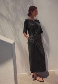 Mujer con cabello oscuro recogido en un moño, vestida con un vestido midi negro de manga corta con un nudo delantero, de pie contra una pared clara texturizada, calzando sandalias negras.