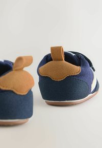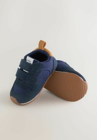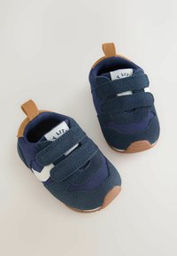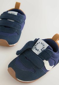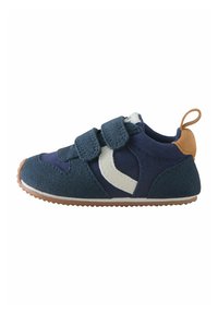 Zapato infantil en azul marino, confeccionado con materiales de ante y textil, que presenta dos correas de gancho y bucle, un acento blanco y una suela de goma texturizada.