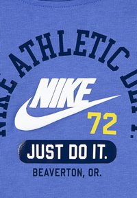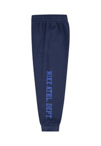 Sudadera de algodón azul con capucha, bolsillo delantero y texto gráfico; combinada con pantalones jogger azul marino que presentan un logo y cintura elástica.