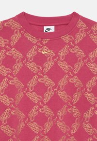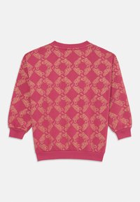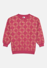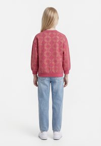 Niña joven con cabello rubio largo, que lleva una sudadera rosa con estampado, vaqueros azul claro y zapatillas blancas, de pie sobre un fondo blanco.