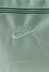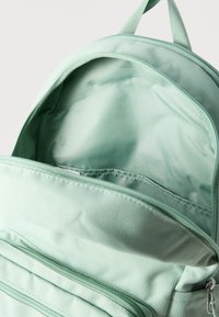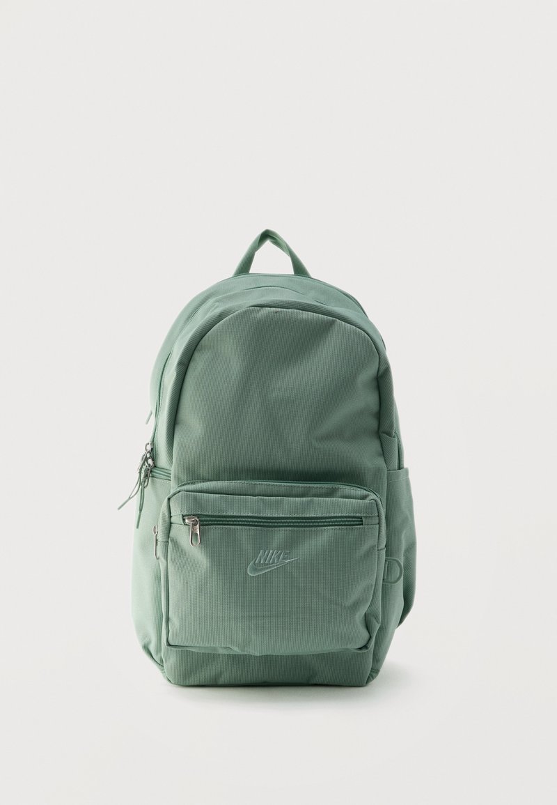Mochila Nike verde menta con bolsillo frontal con cremallera, bolsillos laterales y asa superior, de pie sobre un fondo blanco liso.