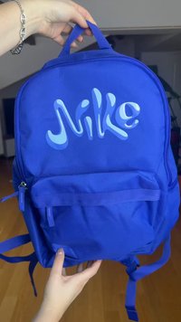 Mochila azul con bolsillo frontal y la palabra "Mike" impresa en letras estilizadas de color azul claro en el compartimento principal.