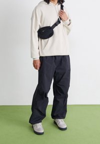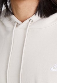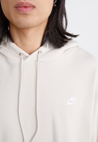 Persona vistiendo una sudadera Nike color crema con bolsillo frontal y cordones, combinada con pantalones negros, sobre un fondo liso.