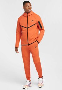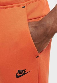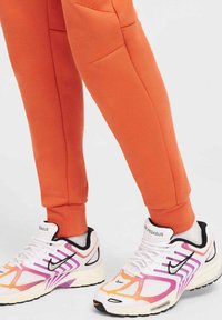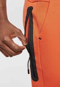 Pantalones jogger naranja con cintura con cordón, acentos negros y bolsillos laterales, confeccionados en una tela suave con un ajuste cónico.