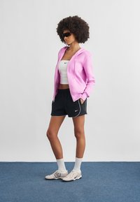 Mujer con afro que lleva gafas de sol negras, sudadera con capucha rosa con cremallera, top tubo blanco de Nike y pantalones cortos negros de Nike, posando con las manos en los bolsillos.