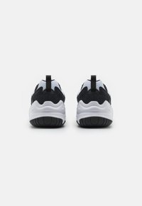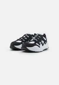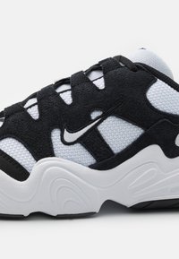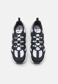 Zapatillas deportivas en blanco y negro con un upper texturizado, puntera redondeada, cordones y una media suela blanca curva con una suela exterior de goma negra.