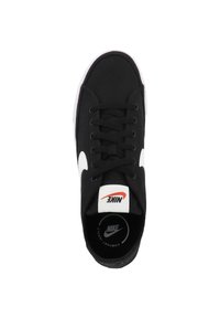 Zapatillas de lona negras con un swoosh blanco de Nike, puntera redonda, suela de goma blanca, detalle de rayas en blanco y negro a lo largo de la parte inferior.