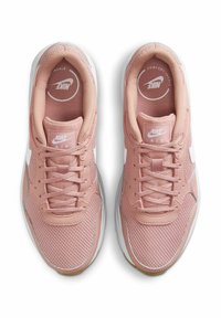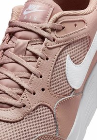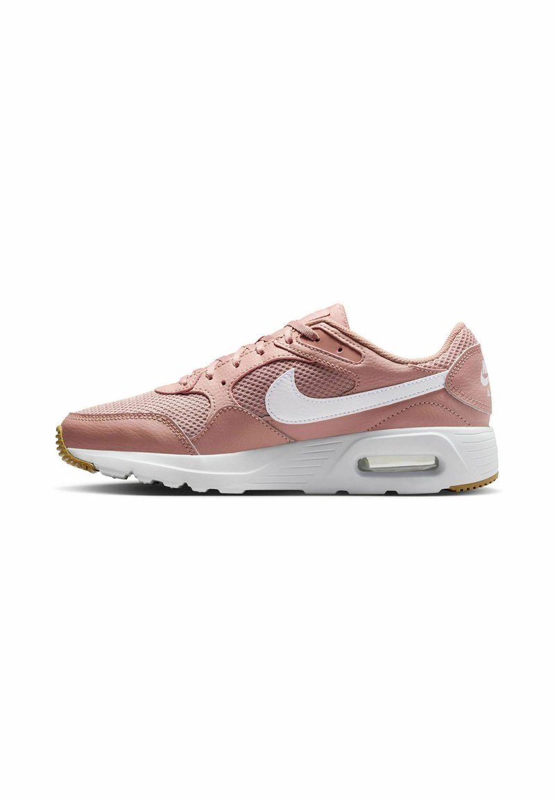 Zapatillas Nike rosas con parte superior de malla y cuero, swoosh blanco, amortiguación de aire visible en el talón y suela de goma texturizada.