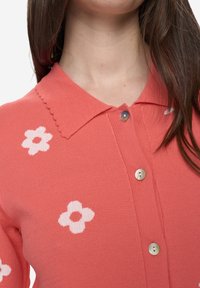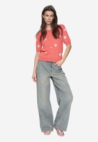 Cárdigan coral de manga corta con patrones de flores blancas, cuello redondo, botones delanteros y dobladillo ondulado; combinado con pantalones de mezclilla azul claro.