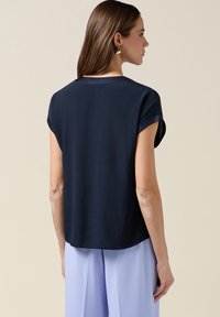 Blusa azul marino de manga corta con escote en V, textura suave y un corte holgado, combinada con pantalones lavanda claros.