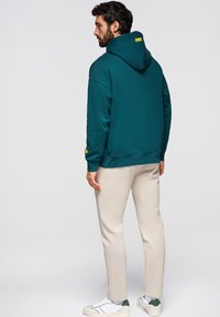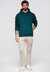 Hombre con pantalones ajustados beige, zapatillas blancas y sudadera azul verdosa, con la mano en el bolsillo, de pie sobre un fondo claro y liso.
