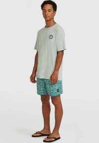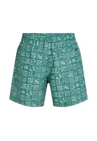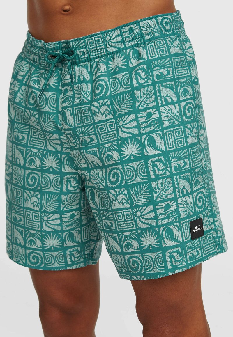 Bañador corto de color verde azulado con patrones tropicales y geométricos blancos, cintura elástica con cordón, llevado por una persona de piel oscura.