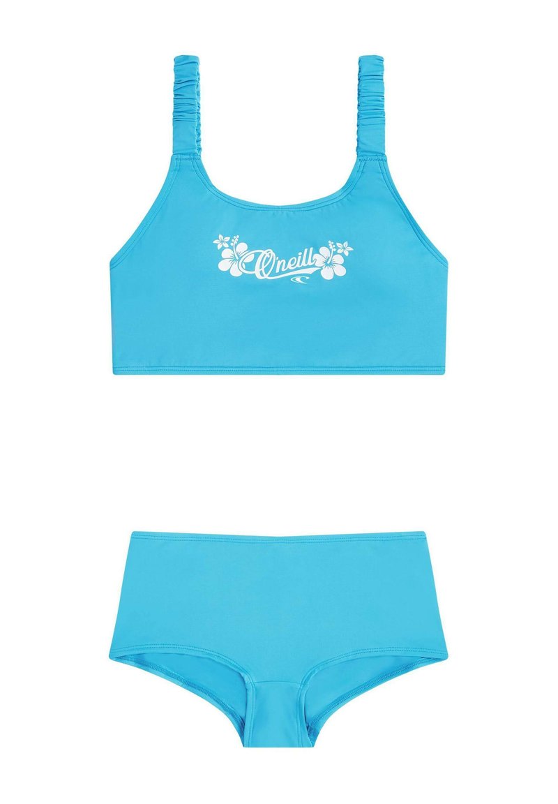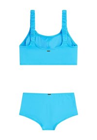 Conjunto de bikini de dos piezas en azul brillante. El top cuenta con tirantes fruncidos y un logo floral blanco. La parte inferior tiene un diseño de talle alto. Textura suave.
