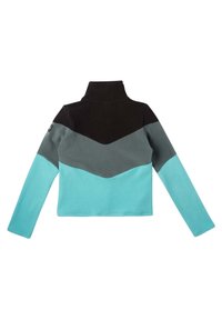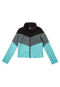 Chaqueta de forro polar con cuello alto, que presenta una sección superior negra, una media gris y una sección inferior turquesa. Cremallera frontal de longitud completa.