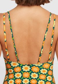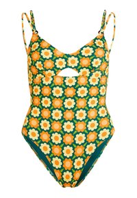 Mujer con un traje de baño de una pieza verde con un patrón floral en naranja y crema y un pequeño recorte debajo del busto, de pie contra un fondo liso.