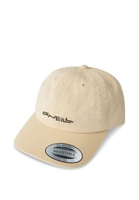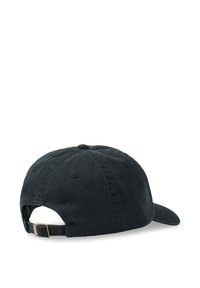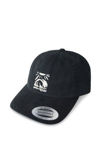 Gorra negra con un diseño gráfico blanco en la parte frontal, llevada por una persona con una sudadera beige que presenta texto impreso y un cuello redondeado.