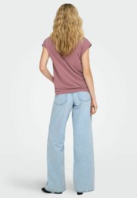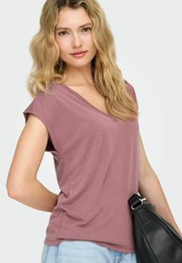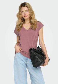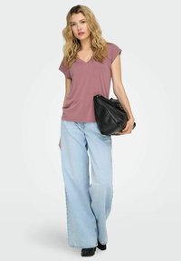 Camiseta de manga corta con cuello en V de color malva, hecha de una tela suave, combinada con vaqueros de lavado claro y corte holgado, y un gran bolso de cuero negro.