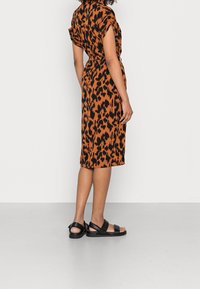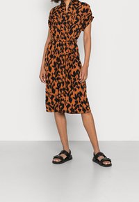 Vestido de estampado animal en naranja y negro, mangas cortas, delantero con botones, cintura ceñida con cinturón, hasta la rodilla, combinado con sandalias planas negras.